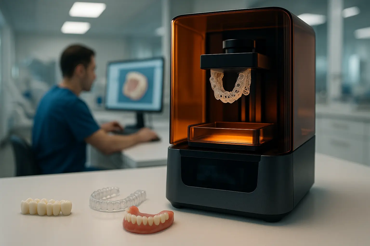 - Gouttières et aligneurs : que ce soit pour l’orthodontie, le traitement du bruxisme ou des protocoles de blanchiment.